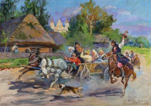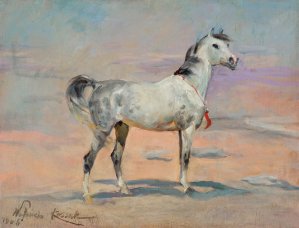 Wojciech Kossak (Paryż 1856 - Kraków 1942 ) – powszechnie znany malarz, postrzegany przede wszystkim jako świetny batalista. Syn i uczeń Juliusza Kossaka kształcił się w krakowskiej Szkole Sztuk Pięknych, w Akademii monachijskiej oraz w Paryżu. W latach 1895-1902 przebywał głównie w Berlinie, pracując dla cesarza Wilhelma II. Wiele podróżował, m.in. do Hiszpanii i Egiptu, gdzie wykonywał szkice do zamierzonych panoram. W późniejszych latach kilkakrotnie wyjeżdżał do Stanów Zjednoczonych wykonując zamówienia portretowe. W 1913 był mianowany profesorem warszawskiej Szkoły Sztuk Pięknych. W latach I wojny światowej pełnił służbę wojskową...