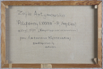 sygn. na odwr. na płótnie: Zofia Artymowska | „Poliformy LXXXXIX“ – B, (replika) | akryl, 1985 (Kompozycja wielokierunkowa) | pani Aleksandrze Kąkolewskiej | z wdzięcznością | artystka