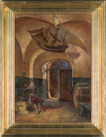 Obraz przedstawia sień kamienicy Fukiera na Rynku Starego Miasta w Warszawie. Dawniej kamienica ta zwana była także domem „Pod Okrętem“, ponieważ w jego sieni wisiał model kupieckiego żaglowca. Mówiono nawet, że tego, kto wrzuci doń monetę niechybnie spotka szczęście.