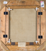 Na odwrocie, na dolnej listwie krosna, dwie nalepki (jedna na drugiej) krakowskiego salonu dzieł sztuki Kazimierza Wojciechowskiego (druk, tusz): 26/9.31 Kupiony u Kazimierza Wojciechowskiego w Krakowie | SALON DZIEŁ SZTUKI | KAZIMIERZA WOJCIECHOWSKIEGO | KRAKÓW, UL. ŚW. JANA L.3. – TELEFON Nr 100-02. | Data przyjęcia 19.9.1931. | Autor Prof. Wojciech Weiss. | Tytuł Akt kobiety | Rodzaj olej Rozmiar | Nr 6558; ponadto na listwach krosna numery odnoszące się do wiel...