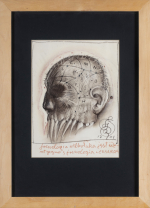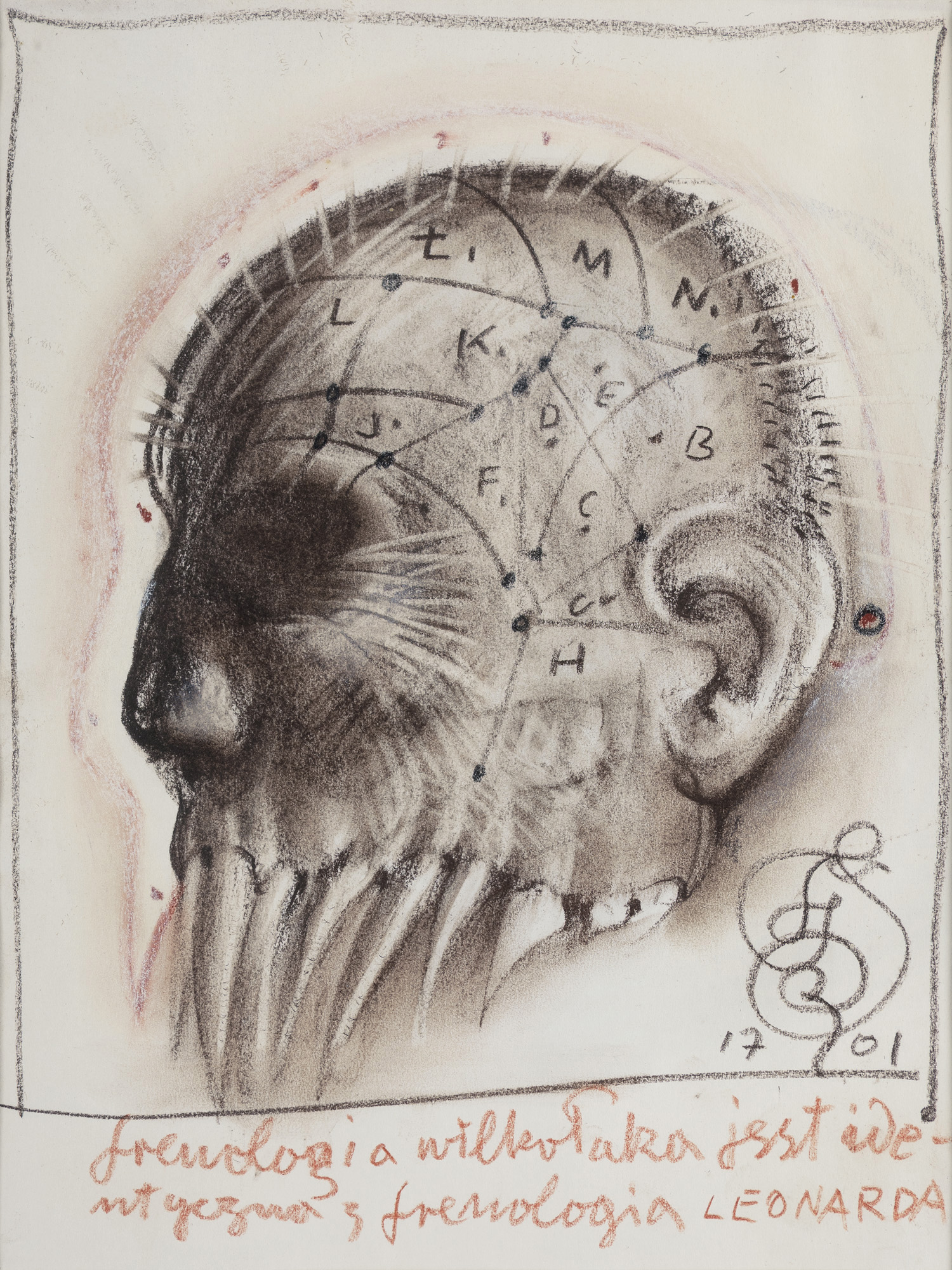sygn. czarnym pastelem p.d.: 17 FS 01 [data przedzielona monogramem wiązanym], niżej brązowym pastelem: frenologia wilkołaka jest ide- | ntyczna z frenologią LEONARDA