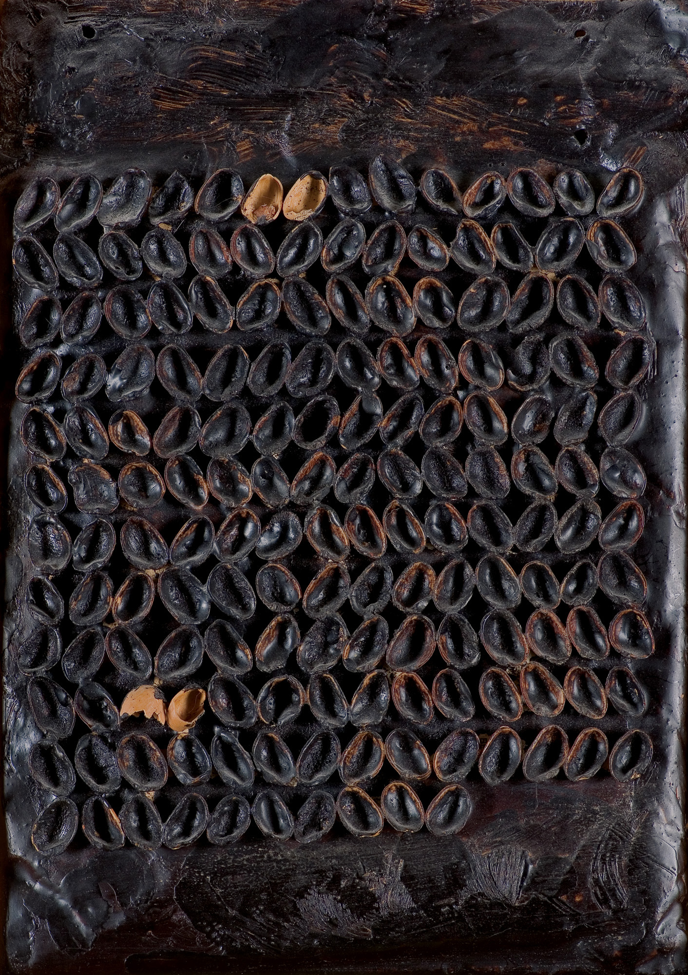 łupiny pistacji, enkaustyka, użyta koperta, płyta