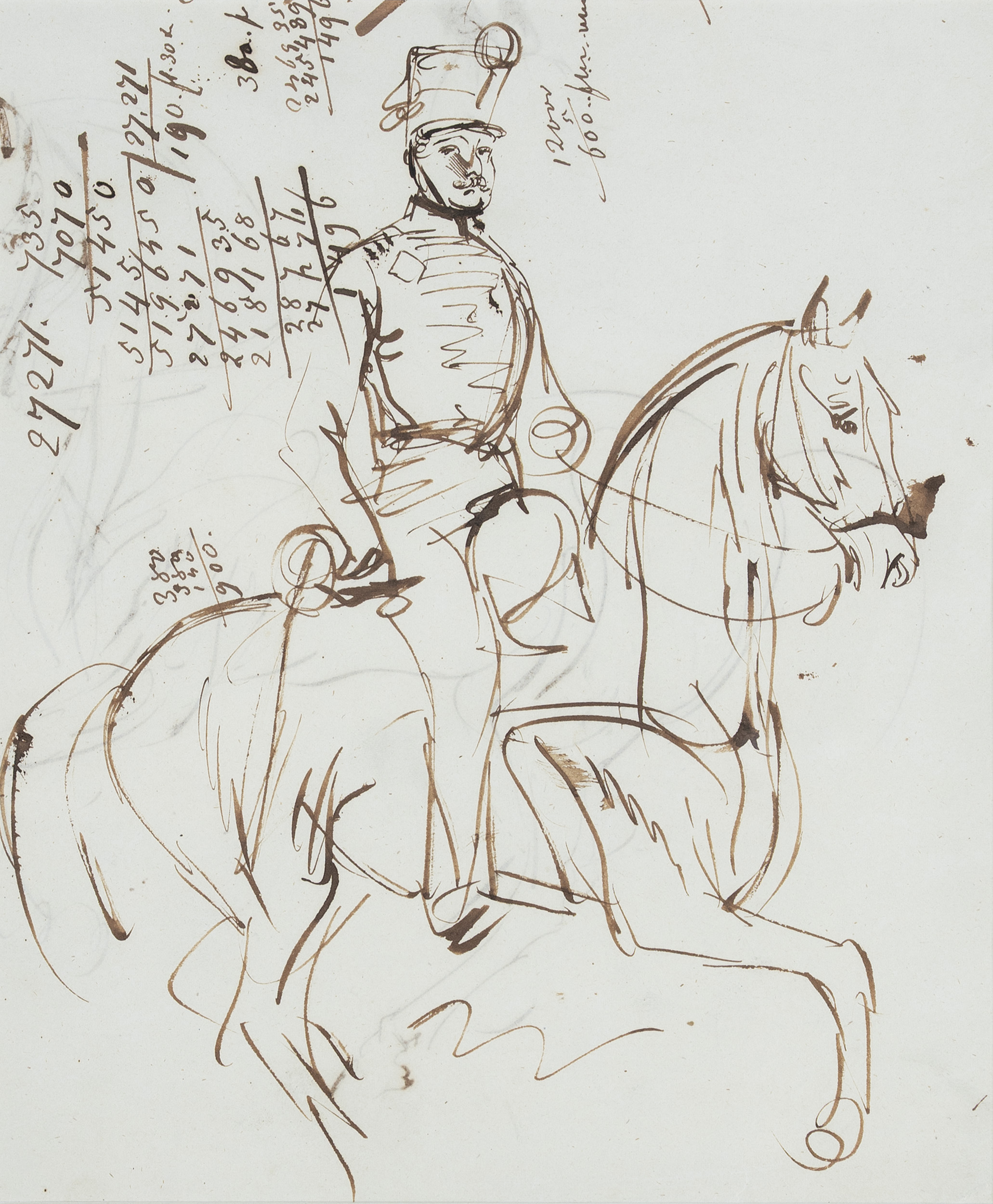 Rysunek przedstawia szkic jeźdźca i obliczenia rachunkowe. Na odwrocie postać jeźdźca na koniu. Część kartki zawinięta.