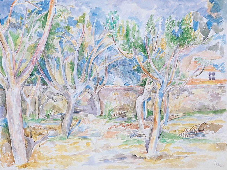 Ponadto nalepka z napisem atramentem: Akwarela 33/44 cm | W ogrodzie Don Ramona | w Sigüenzy | Hiszpania | Wł. Jahl | Paris XV | 14. Francois Guibert.